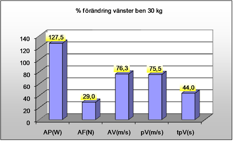 Ellinor har haft en mycket bra utveckling på vänster och höger ben. Största ökningarna ligger på effektutvecklingen vilket är mycket glädjande. Men vi kan se mycket bra ökningar i topphastighet och tid till topphastighet vilket är mycket väsentligt vid styrkträning och omvandling till det man ska bli bra på. Eftersom Ellinor även har tränat badminton från barns ben hade hon redan innan vi började med styrketräning ett mer koordinerat och starkare höger ben inte så konstigt eftersom alla utfall görs på höger ben. Det som däremot är positivt är att Ellinors vänster ben har utvecklats mer än höger benet vilket har lett till en mer balans mellan benen styrkemässigt. Hade vi bedrivit all träning på två ben hade detta aldrig hänt utan differensen mellan benen hade varit den samma som när vi började.